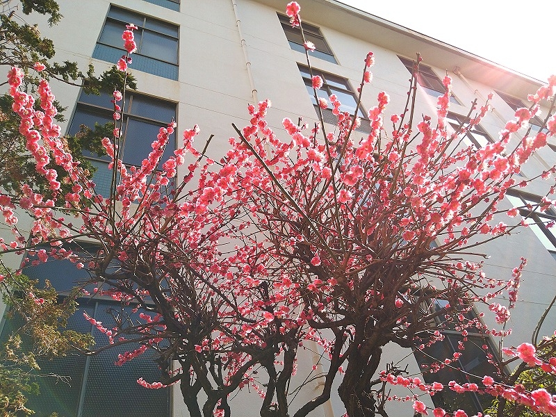 校内の中庭にある梅の花が満開です。あふれて零れ落ちたように、池の水面や石橋に花びらが散り敷かれていて、夢のような景色です。しばらく立っていると、ここが新宿であることを忘れてしまいます。校歌では、成女生も喩えられて歌われて…