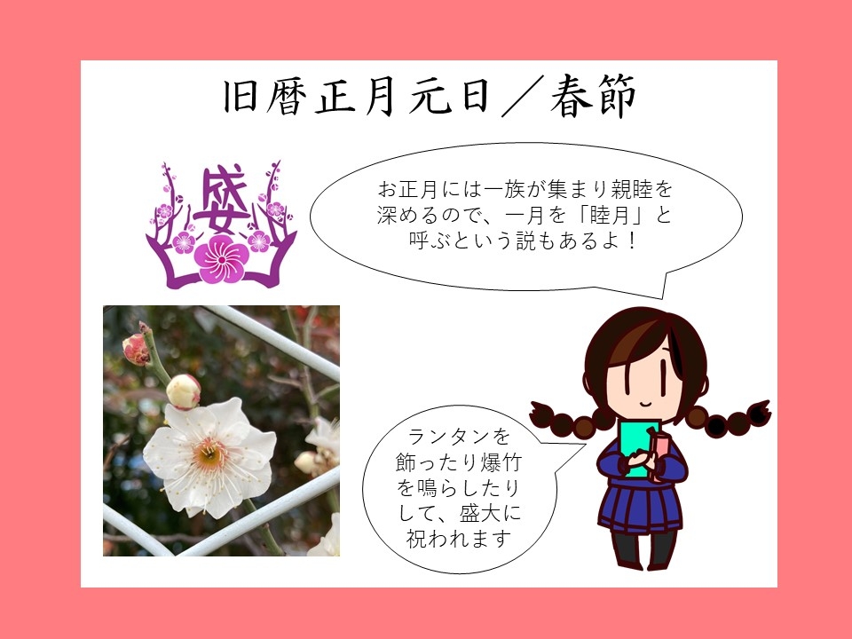 旧正月を迎え、中国や台湾をはじめとした各国で、春節をお祝いをしている様子がニュースにも流れました。横浜中華街などでも「春節」のイベントがさまざまに開かれているので、生徒たちも聞き覚えのある人がいたようです。 旧正月の前後…