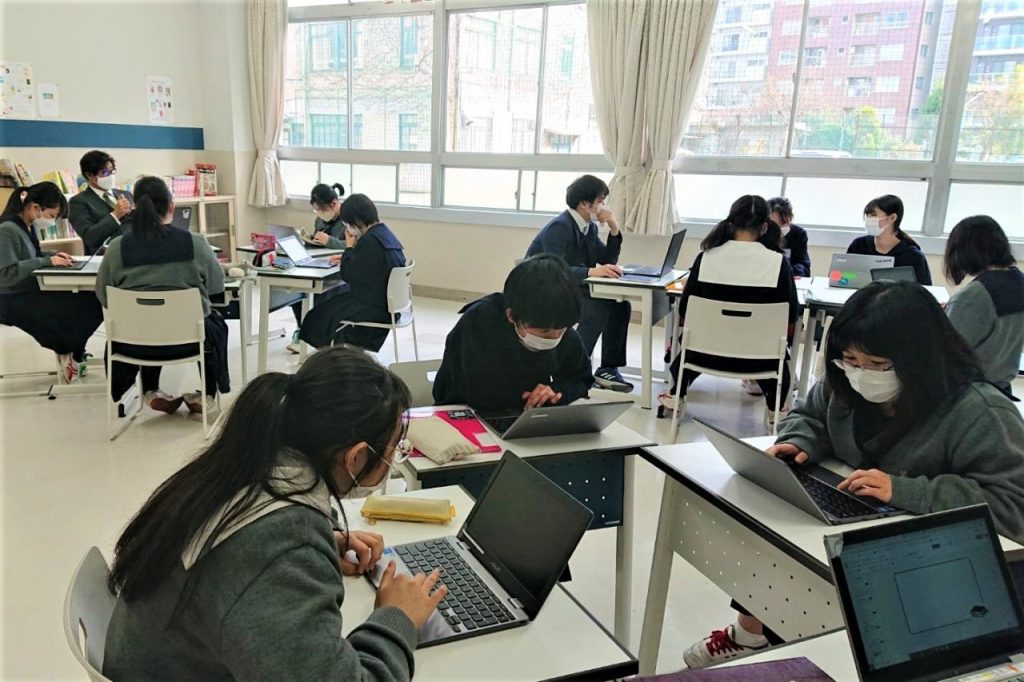 現在、共同で課題に取り組んでいる最中の高校一年生。芸術ゼミでは「舞台芸術」をテーマに、よい舞台を作り上げるために必要なものは何かを考えています。前段階として、舞台に携わるお仕事を調べ、本校の表現教育の先生方(実際に声優や…