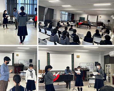 先日は1年生も見学する中、ある一場面のお稽古をしました。最初は自分たちで感じるがままにお芝居して見ました。講師の先生からアドバイスをいただき、動線や視線などを考えて、再度チャレンジ。セリフと動作、歌をテンポよく進めていく難しさを感じました。お稽古の見学している1年生たちも、身体が前のめりになる位、一緒に熱心に見ていました。2月の本番まで引き続きお稽古を頑張りましょう♪