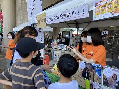 ブースではストップウオッチチャレンジのゲームを行い、±0.1秒だったら参加者に日焼け止めボトルをプレゼントするという企画です。ゲームは大盛況で、子ども連れのご家族の行列が絶えず、用意した日焼け止めも品切れに。暑い中でしたが、笑顔で子どもの日焼け止めの大切さをアピールしてきました!