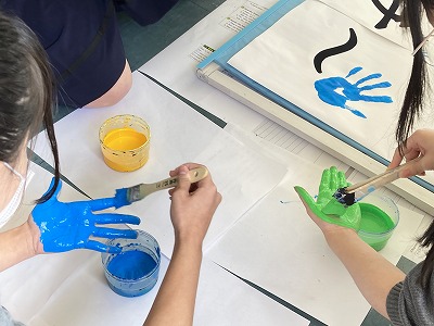 みんなで手にカラフルなペンキを塗って、記念祭テーマ「青春SPARK~つながるココロ・ひとつのカタチ~」の文字のまわりに、手形をペタペタ♪