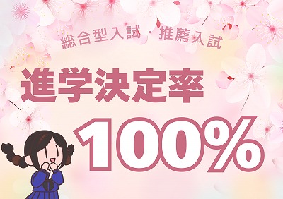 本校の大学受験は、「総合型入試」「推薦入試(指定校・公募)」の合格率が高いのですが、なんと昨年に引き続き、今年も総合型・推薦での進学決定率100%を達成!