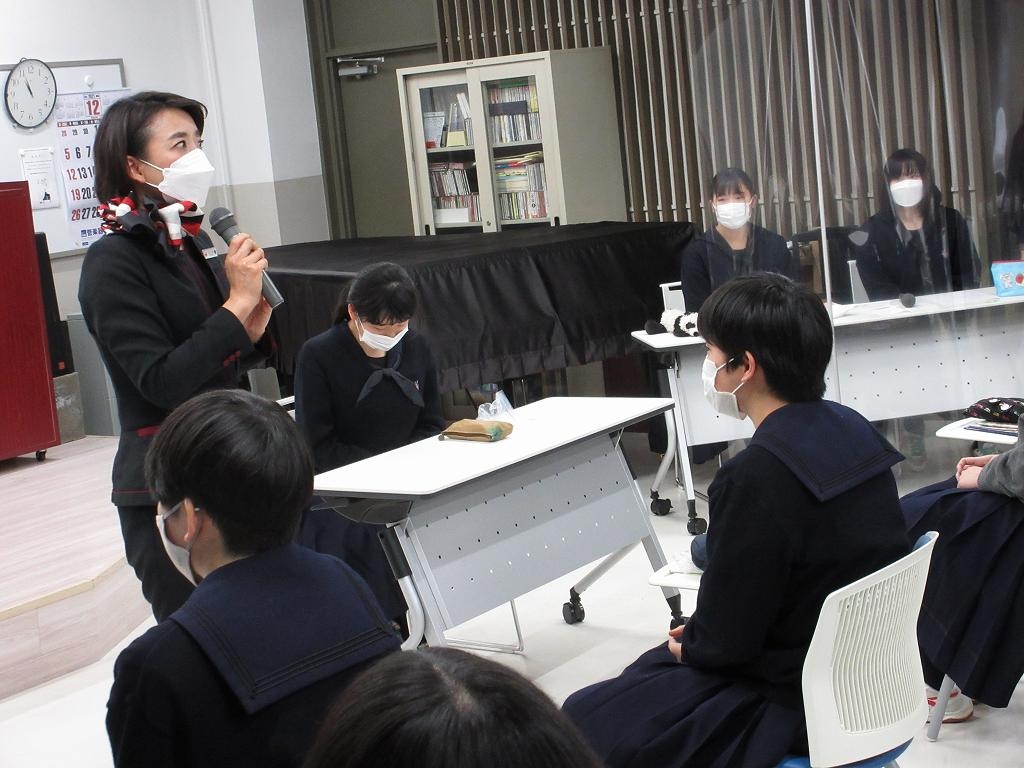 本校では礼法教育及びキャリア教育に力を入れており、客室乗務員として田幸氏が大切にしている接客時の心構えやコミュニケーションの取り方などを教えていただきました。