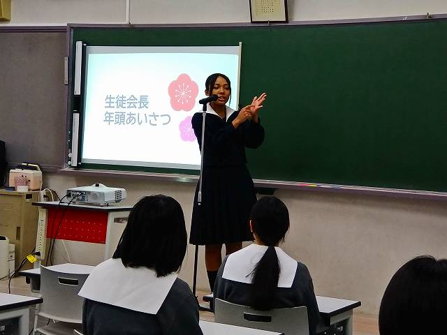 生徒会長の明るい年頭あいさつで、皆一気に笑顔に!