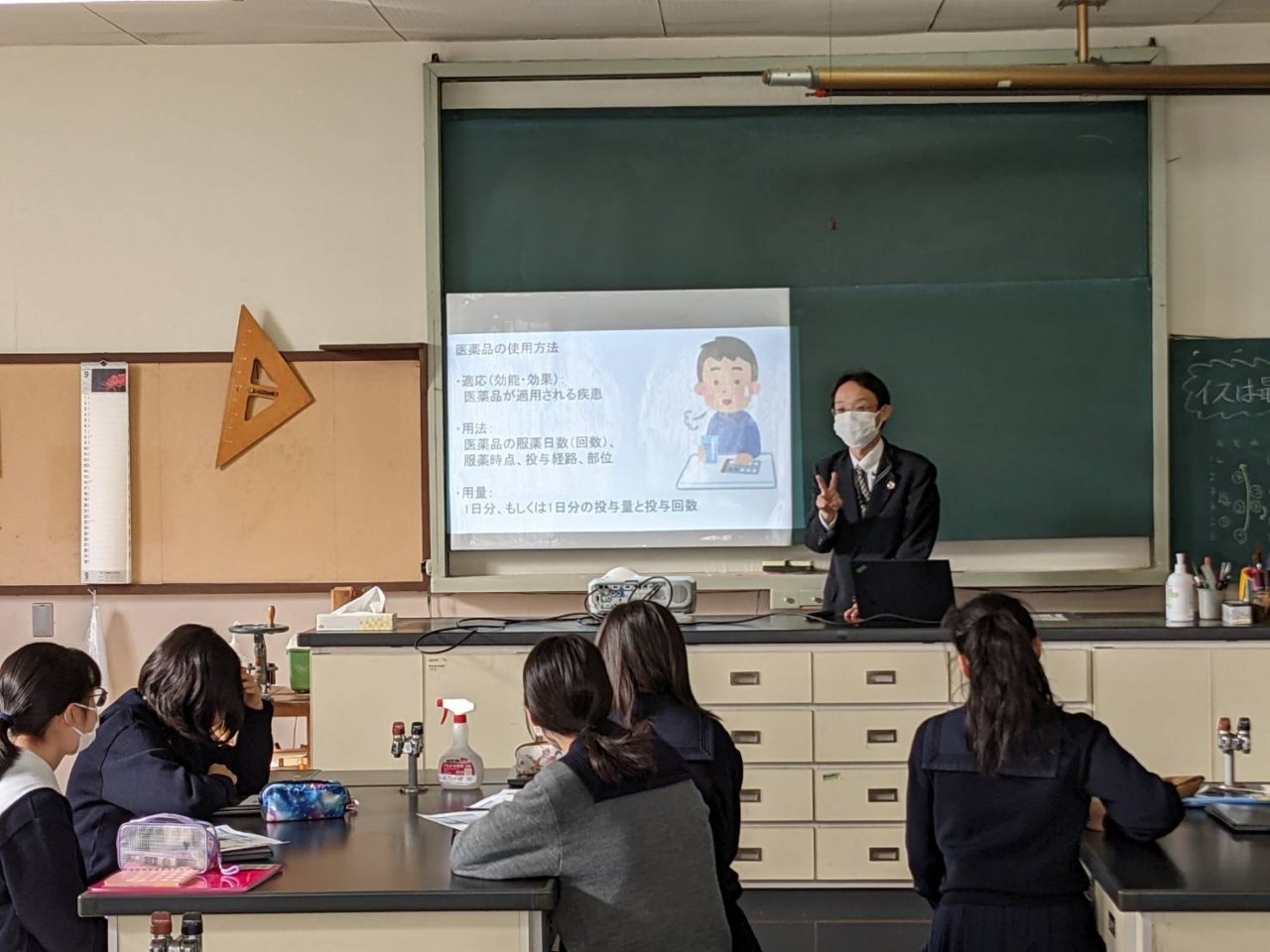 内容的には難しい部分もありましたが、担当していただいた栗田 拓郎先生の軽快な講義のもと、生徒たちは普段何気なく使用している薬の適切な使用の大切さを興味深げに学習していました。