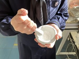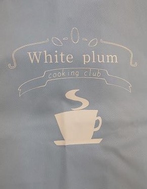 今年のエプロンは、水色に白でチーム名「White Plum」とカップの絵が描かれています。