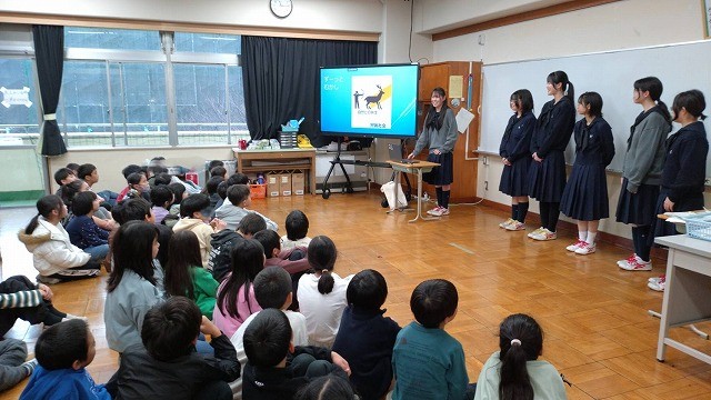 プレゼントの日には、代表生徒が小学校を訪れ、制作過程を紹介しました。