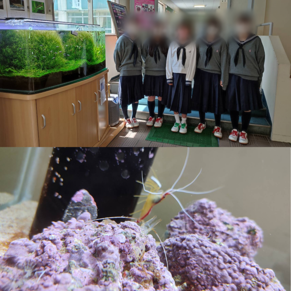 海水魚の水槽ではエビが脱皮をしました。夏に向けてすくすく成長している成女の生き物たち。みんな元気に育ってね。 去年までは2名で、今年高校生が2名増えました。更に先日中学生の新しい仲間が1名加わりました。部員が増えてとても…