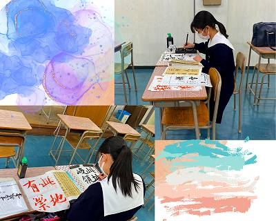 書道部の今年の目標は、「書と私」です。大きな紙で作品を作ったり、色紙に作品を作ったり……各々が制作活動に没頭しています。記念祭での展示発表に向けて、作品を書き溜めていたり、練習をしたり、一筆に…