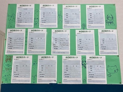 高1クラスの自己紹介カードが完成しました!「私も同じキャラクターが好き!」「おすすめの曲ってある?」お互いの趣味や性格、好きなものをきっかけに会話にも花が咲きます♪それぞれのカードの隙間には、生徒たちがイラストを描きより…