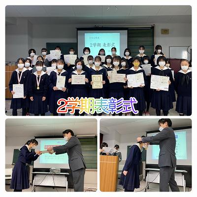 2学期末に行われた終業式の様子をお伝えします。 終業式前にまずは表彰式を行います。2学期表彰式では各資格検定の合格者、英語科の表彰、顕著な活躍が見られた生徒に送られるメダル表彰及び成績優等者(全教科の平均点が80点以上)…