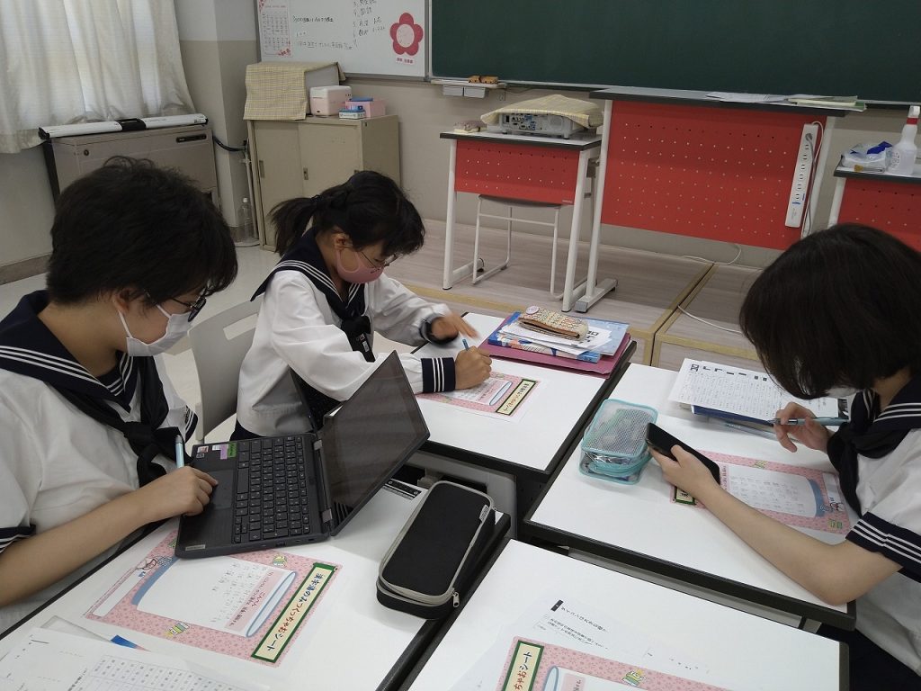中一国語では、漢字の組み立てと部首について学習しています。この日は、『漢字湯のみをデザインしちゃおう』と題し、「ごんべん」の漢字を調べて、湯のみ型のプリントに書き込んでいきました!その後、中から自分のお気に入りの漢字を選…