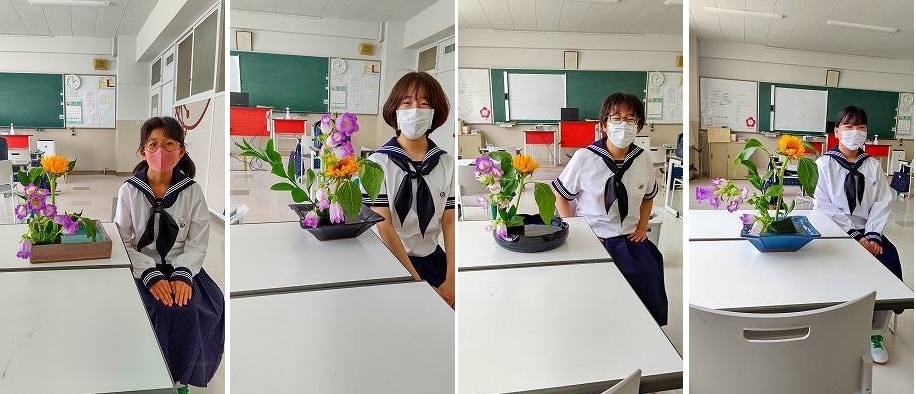 中学校1年生の礼法の授業では、初めて花を生けてみました。 花の茎を花器で測って長さを決めたり、花の向きを探したり、すっきり見えるように工夫をしました。 〔編集委員〕