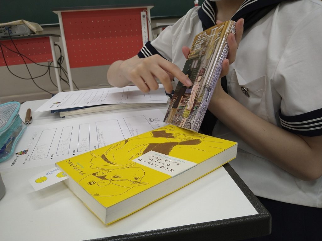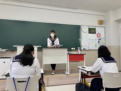中1国語の授業では、ビブリオトークをしました。ビブリオトークは、お気に入りの本を持ち寄って、好きなところや、おすすめしたいポイントを自由に話します!制限時間は3分間。作品全体の内容を説明してくれたり、登場人物の性格を熱く…