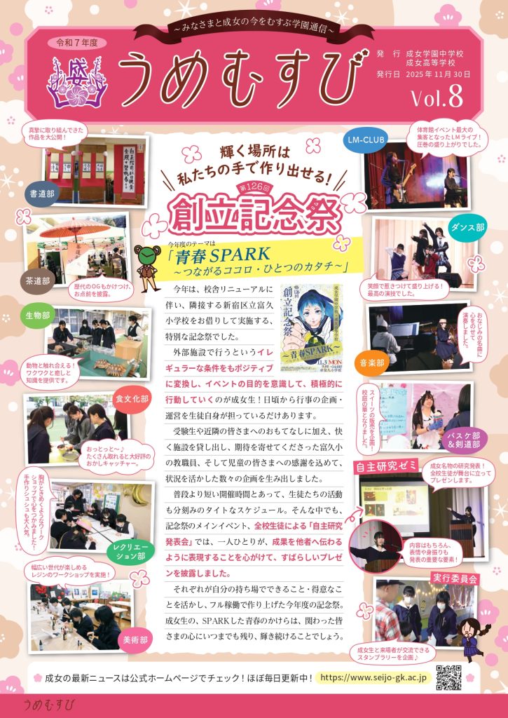 創立記念祭の特集です 成女の広報誌「うめむすび」。 Vol.8は、創立記念祭、制服新オプション品誕生、リーダーシッププログラムを特集しています。 秋の記念祭は、校舎リニューアルに伴い、隣の富久小学校施設をお…