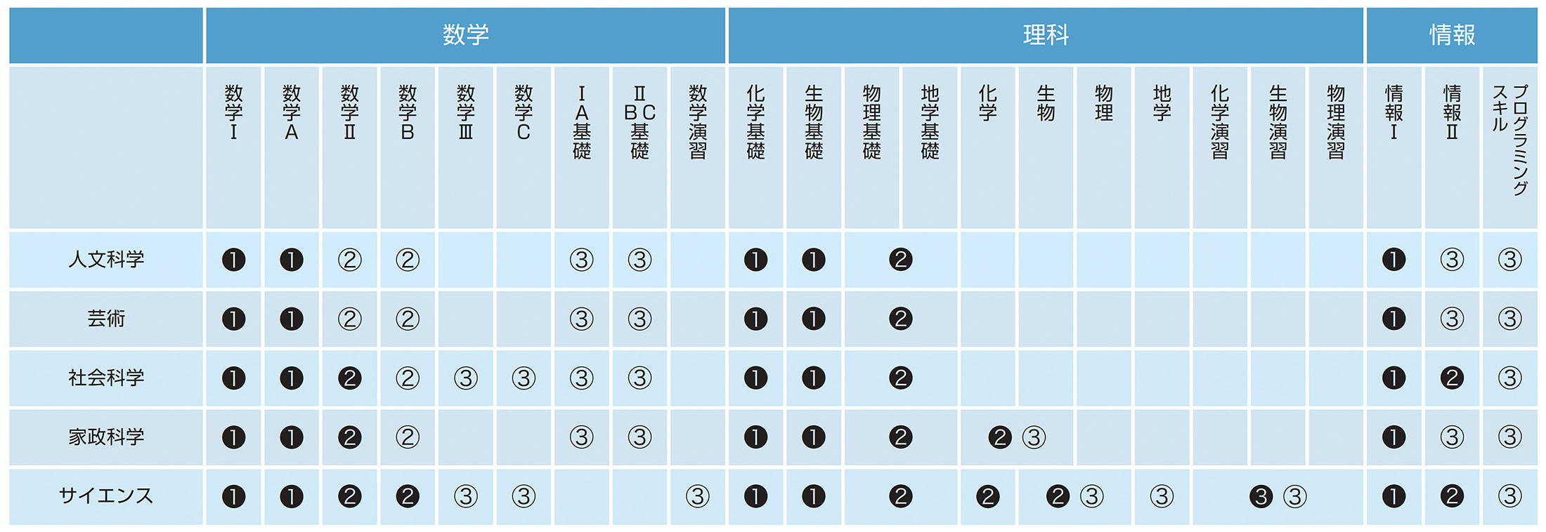 ベースごとの理数系科目一覧