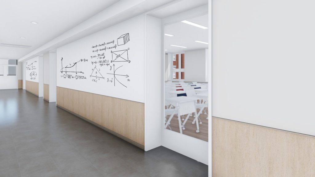 海外の大学をイメージしたアカデミックな外観、明るい色調の落ち着いた校内は、生徒たちが将来の夢を描くのにぴったりの環境です。DXハイスクールにふさわしい多彩なICT設備も備え、生徒たちがキャリア教育と探究的な学びに集中できる最先端の校舎です。