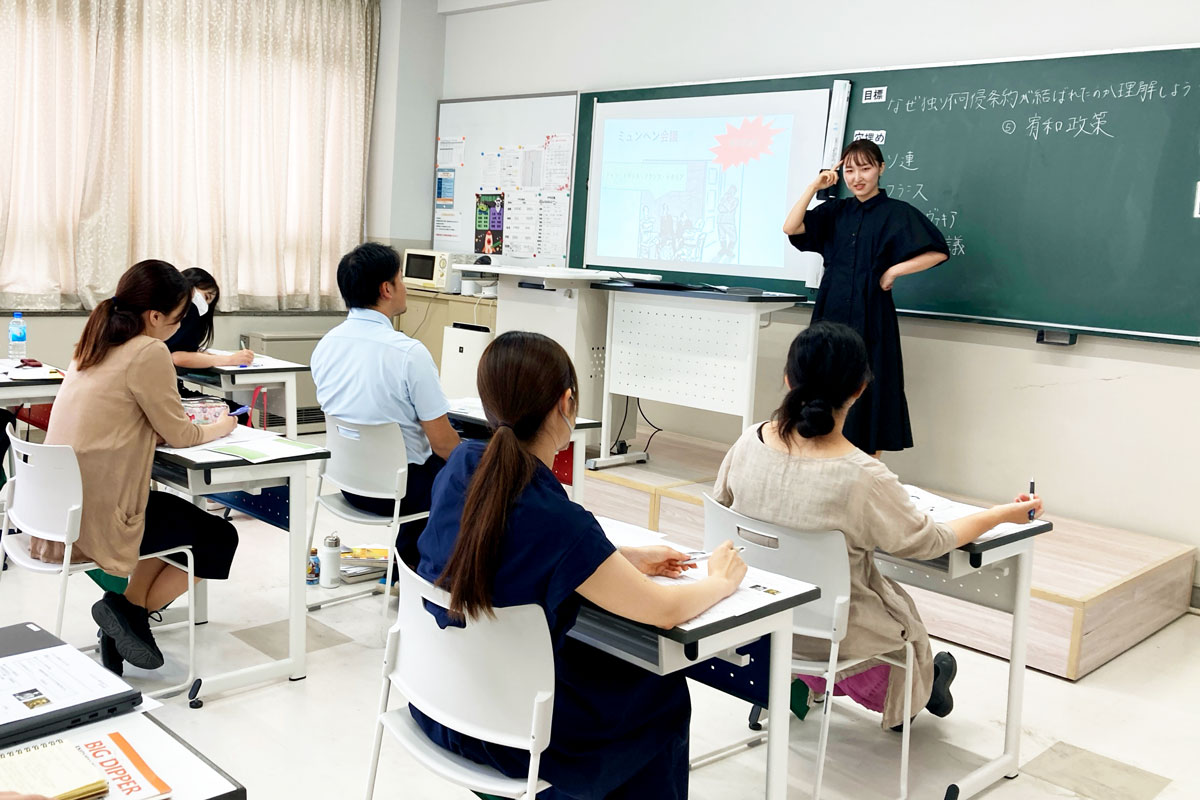 まず、模擬授業形式の基礎研修で、発声・視線・板書などの基本動作から、授業構成や説明方法などの基礎力をチェックしていきます。